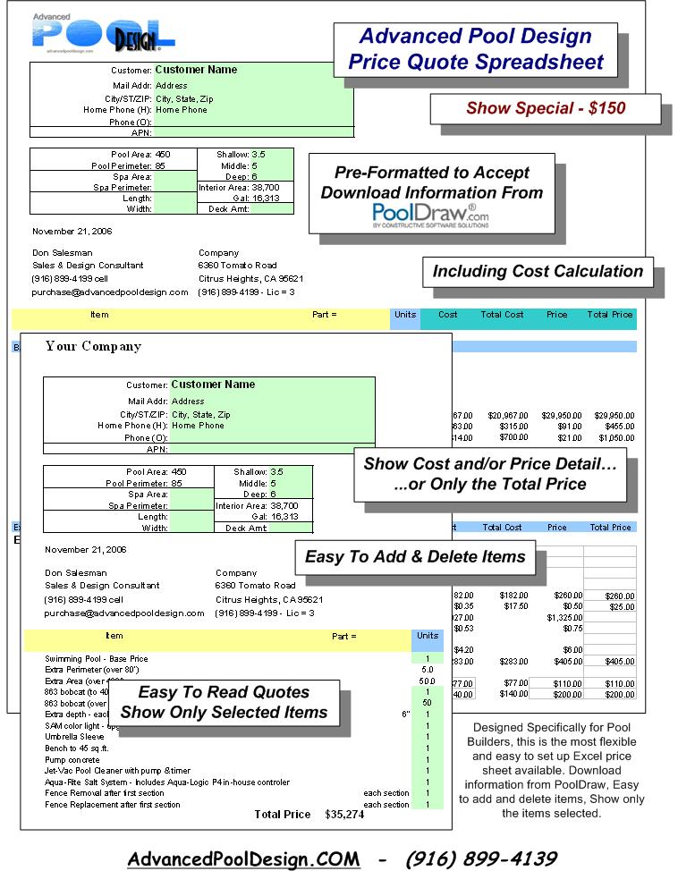 Excel Price Quote Spread Sheet Pre-Formatted to Accept Download Information From PoolDraw... ...Or Works as a Stand-Alone Pricing Program
